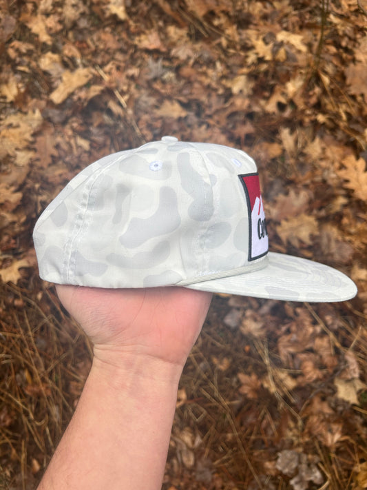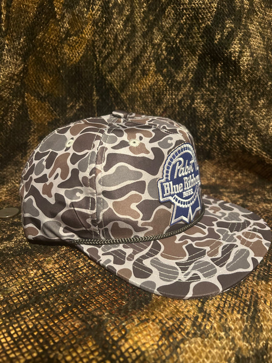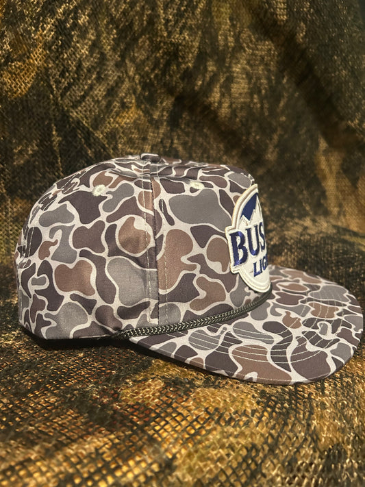 Busch Light retro vintage patch on a smokeshow Camo ropebrim SnapBack
