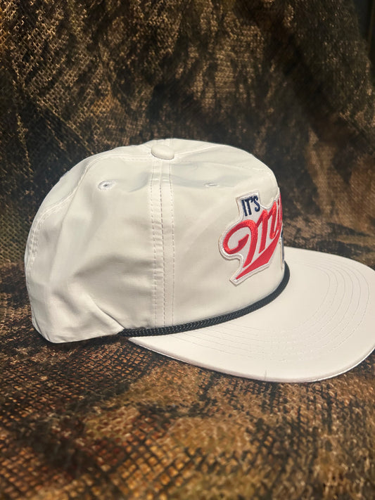 Its Miller Time retro vintage patch on a white ropebrim SnapBack
