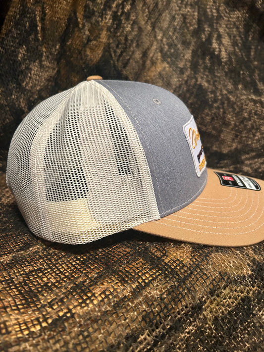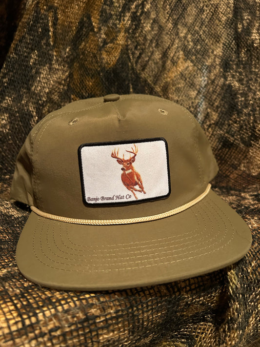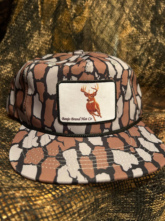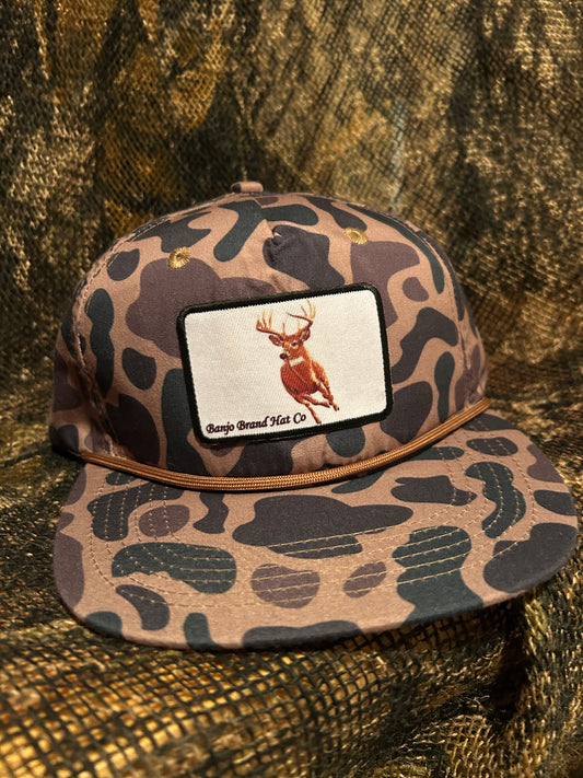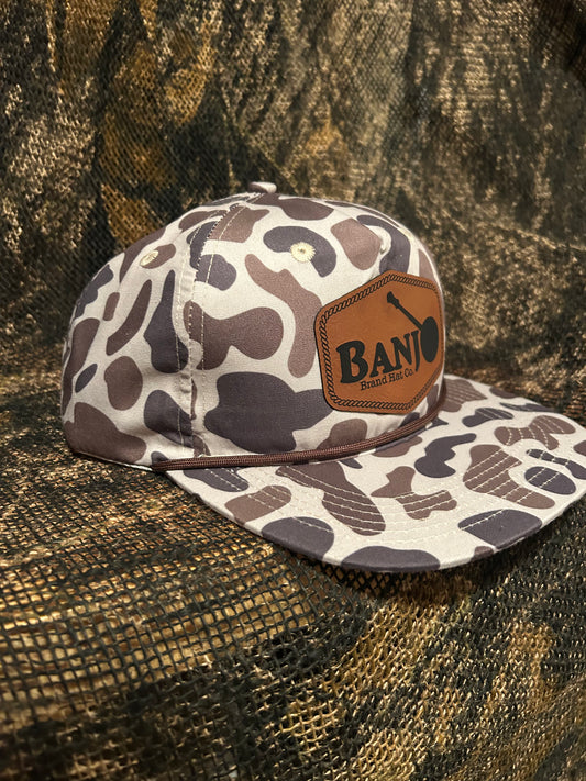 Banjo Brand leather patch on a retro camo SnapBack hat