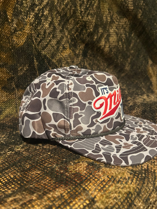 Its Miller Time retro vintage patch on a smokeshow Camo ropebrim SnapBack