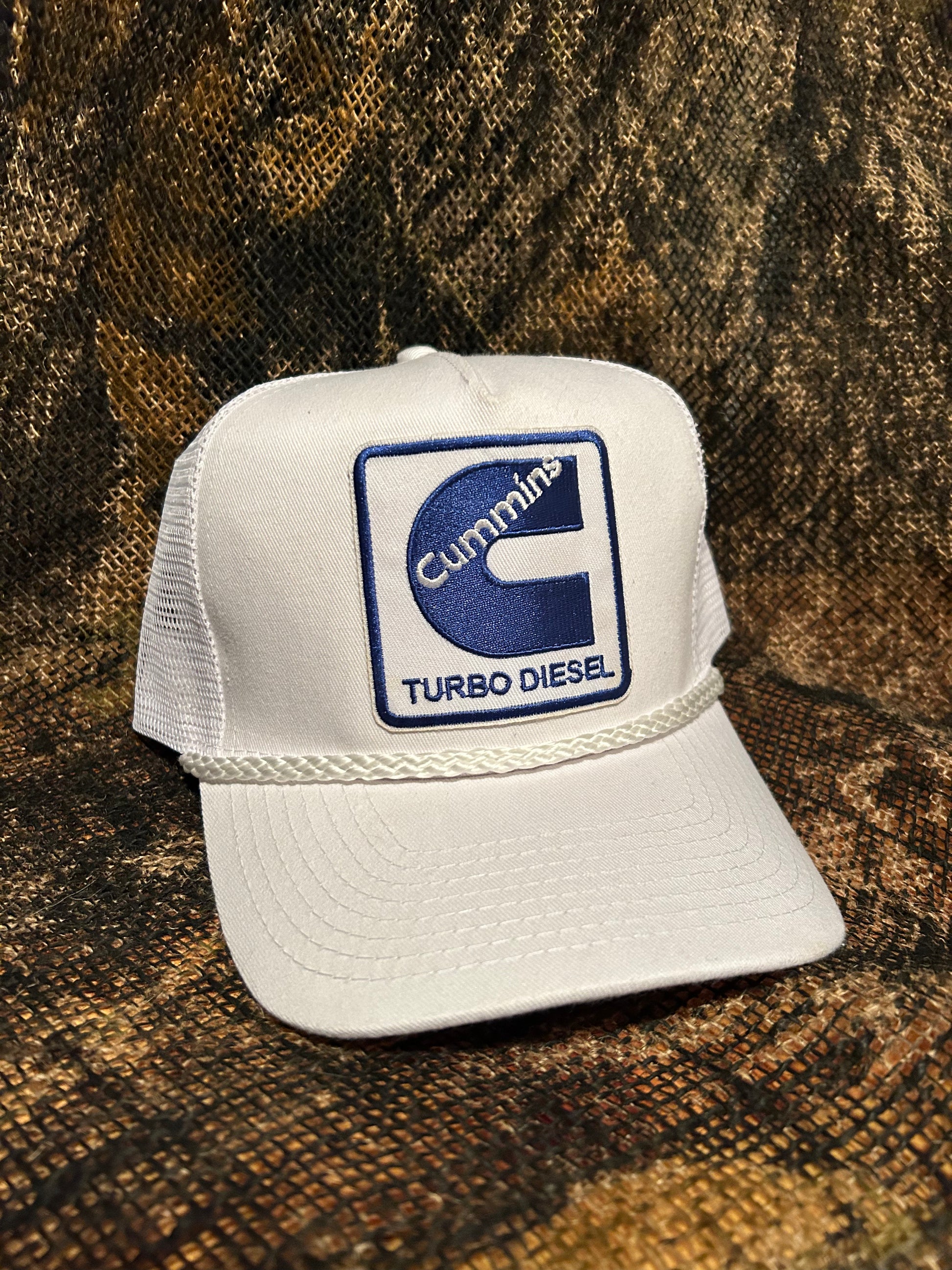 Cummins Turbo Diesel patch on a all white Ropebrim SnapBack hat